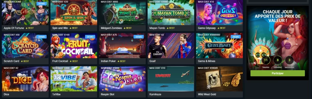 1xBet propose un large choix de jeux de fournisseurs renommés, qui garantissent une expérience de jeu passionnante et variée. Que vous soyez un fan de machines à sous, de jeux de table ou de casino en direct, vous trouverez quelque chose qui correspond à vos préférences.