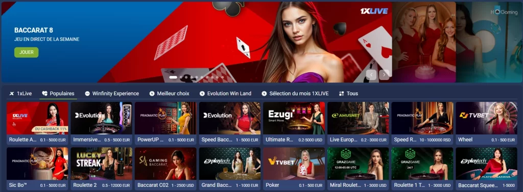 Découvrez la sélection de jeux en direct disponibles sur 1xBet, avec des tables animées par des croupiers et des mises adaptées à tous les joueurs. Du blackjack au poker en passant par la roulette et les jeux télévisés, chaque option propose une expérience fluide et engageante.
